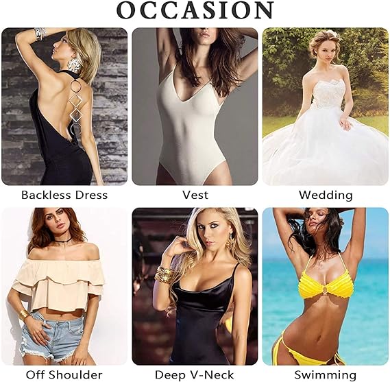 - Versatilidad de Uso: Perfecto para usar con una amplia variedad de prendas, como se muestra en la imagen (vestidos de hombros descubiertos, escotes en V y tops con espalda de tiras).