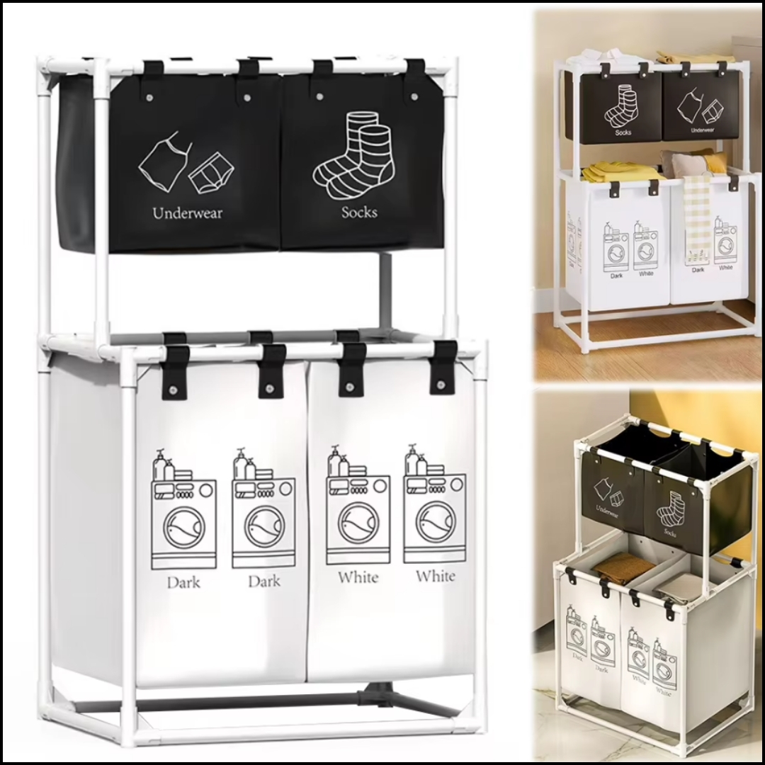 - Separadores Múltiples: El cesto principal se divide en compartimentos para ropa oscura y clara. Además, incluye bolsas superiores más pequeñas para artículos delicados como ropa interior y calcetines.