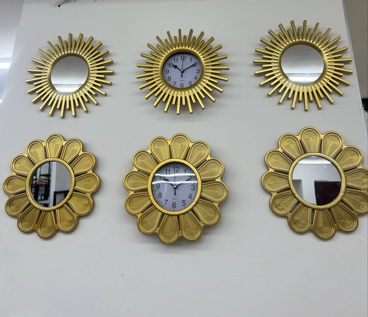 ✨ Set de relojes y espejos decorativos enmarcados en dorado.